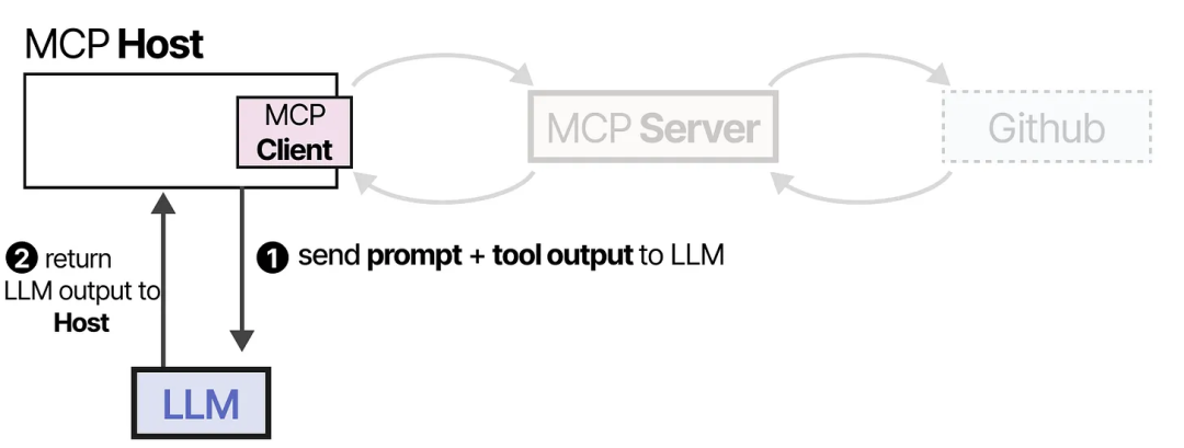 LLM 接收这些信息后,可能会选择使用某个工具。它通过 Host 向 MCP Server发送请求,然后接收结果,包括所使用的工具。