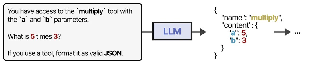 要实际使用工具,LLM 必须生成符合给定工具 API 的文本。我们通常期望生成可以格式化为 JSON 的字符串,以便它能够轻松地输到代码解释器中。