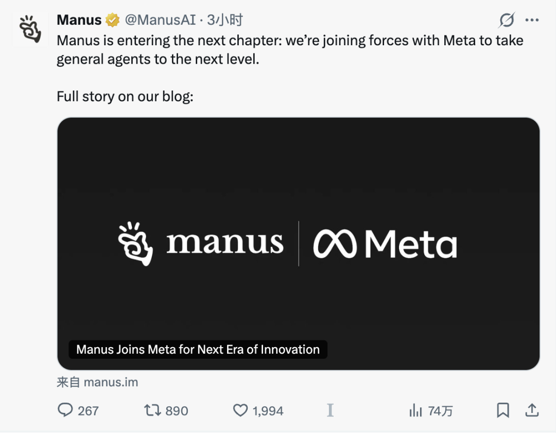 2025年12月30日,传来一个震动科技圈的消息:Meta宣布完成对AI初创公司Manus的收购。这场由CEO扎克伯格亲自操盘的谈判仅用十余天敲定,交易对价超过20亿美元(约合人民币140亿元),花费仅次于 WhatsApp 和 Scale AI。(目前这个收购在审查中)