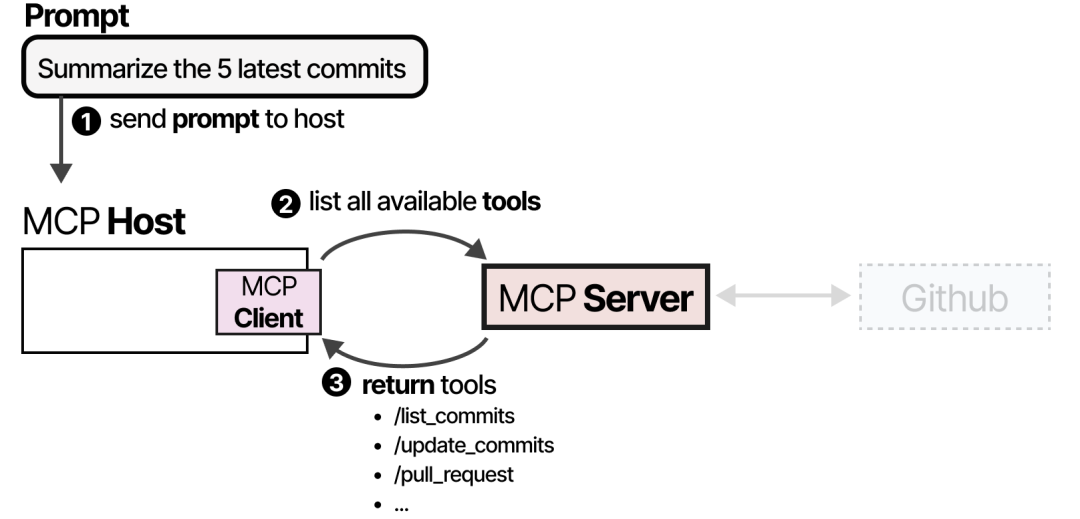 例如,假设你希望某个 LLM 应用程序总结你的代码仓库中最新的5个提交,MCP Host(与 MCP Client一起)会首先调用 MCP Server 询问哪些工具可用。