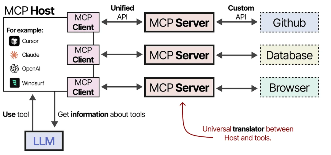 这个框架通过连接到任何 LLM 应用程序都可以使用的 MCP Servers,使创建工具变得更加简单。因此,当你创建一个与 Github 交互的 MCP Server时,任何支持 MCP 的LLM 应用程序都可以使用它。