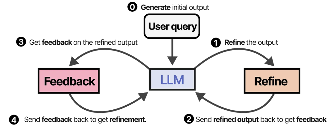 一种类似但更优雅的技术被称为Self-Refine,其中反复执行精炼输出和生成反馈的行动。
