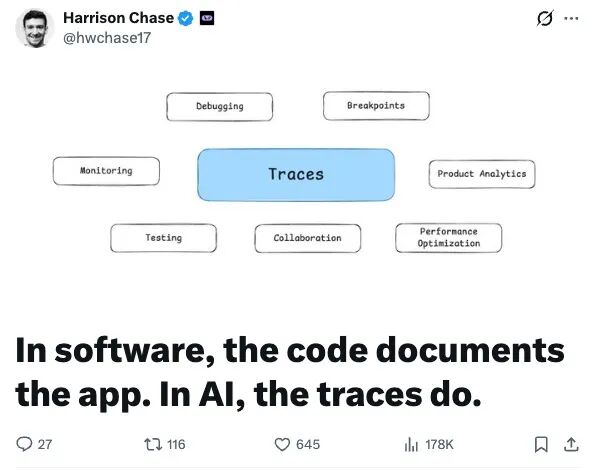 一个直接后果是:为了弄清楚应用到底在做什么,你不能看代码,你必须看它在真实运行中做了什么。这也是为什么我们做的产品里,最受欢迎的之一是 LangSmith。LangSmith 的一个核心能力是 tracing(追踪 / 执行轨迹)。为什么 trace 这么受欢迎?因为它能把智能体每一步内部发生的事情都清清楚楚地展示出来。