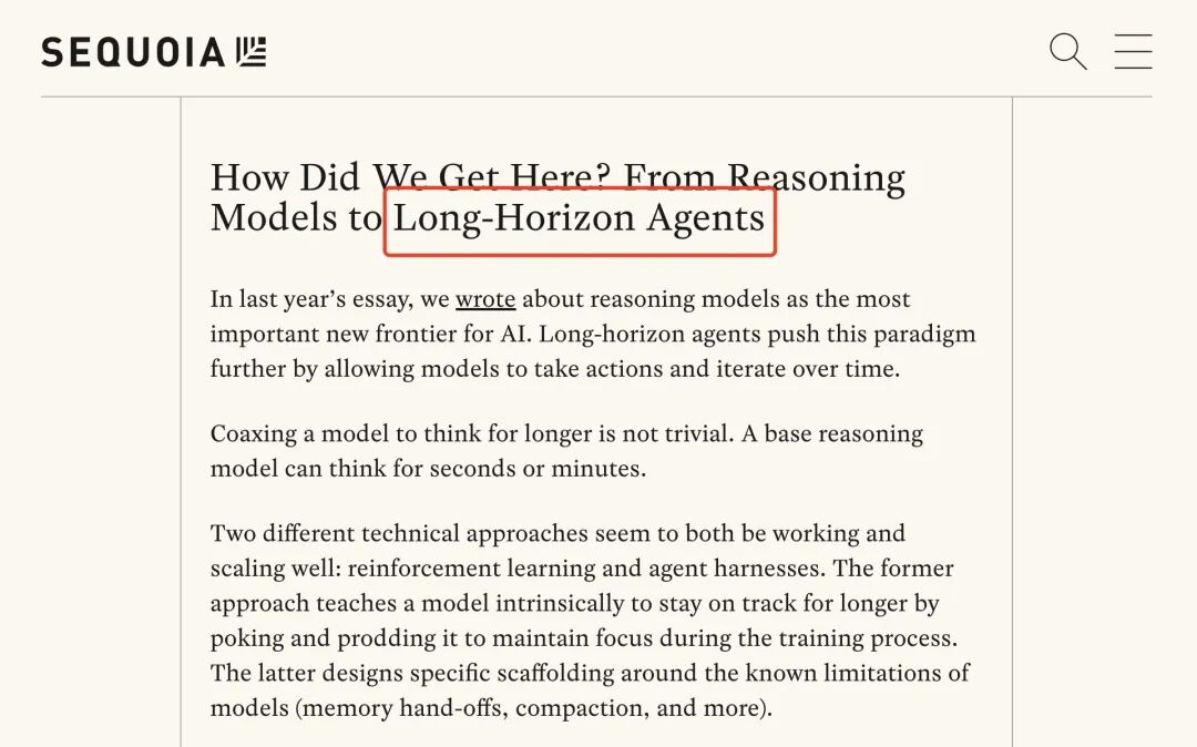 “在去年的一篇文章中,我们曾提出:推理模型(reasoning models)是 AI 领域最重要的新前沿。而“长任务 Agent”(long-horizon agents)则在这一范式之上更进一步——它们不只是思考,还能够采取行动,并在时间维度上不断迭代。”