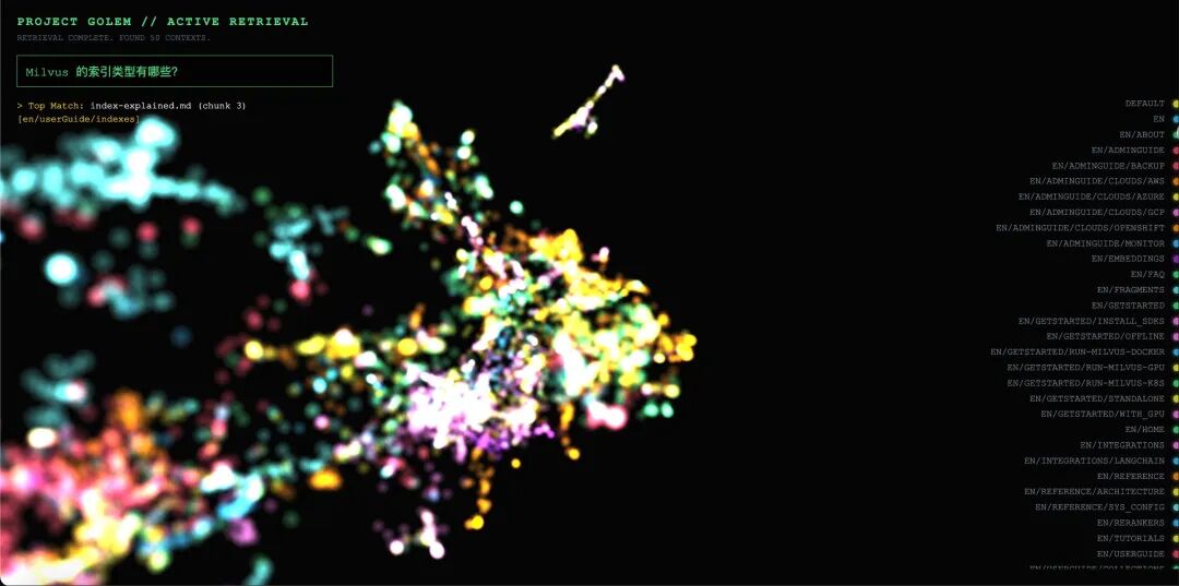 Project_Golem 的出现,提供了一些新的解决思路 :通过 UMAP 降维 + Three.js 渲染,我们可以将高维向量空间映射为 3D 可视化界面,让不同语义分块的空间分布、 RAG 的检索轨迹变得清晰可见,从而高效找到问题所在。