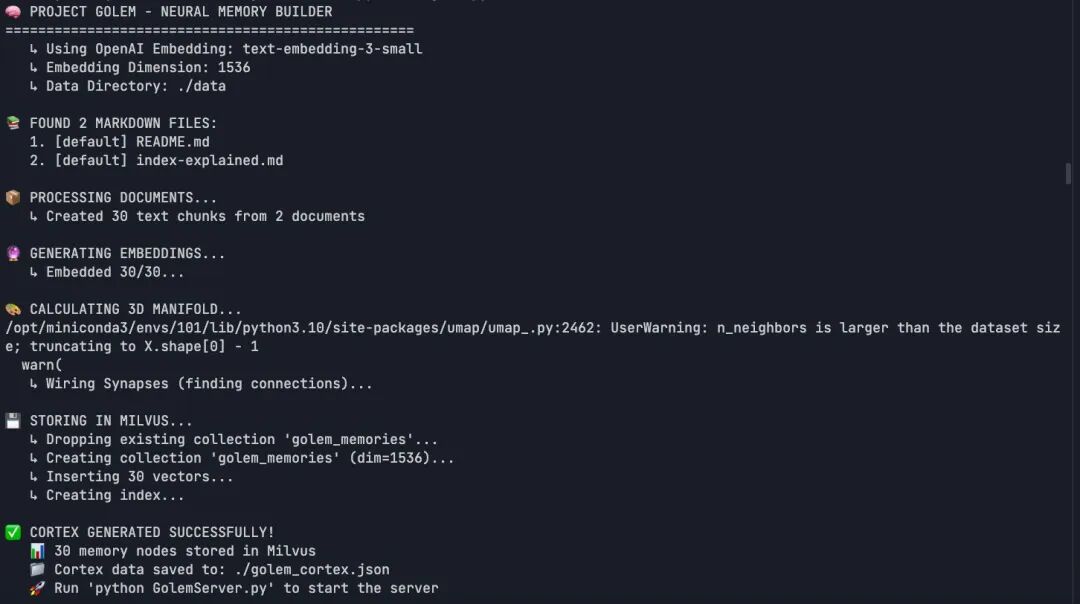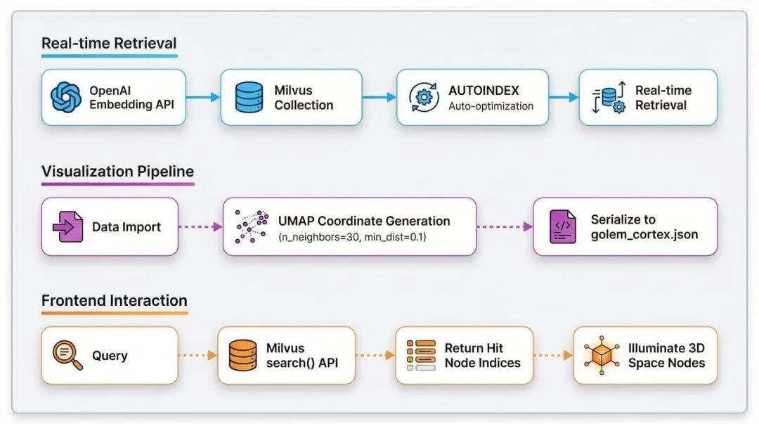 数据导入时生成 UMAP 3D 坐标(n_neighbors=30, min_dist=0.1)→ 固化到 golem_cortex.json → 前端根据 Milvus 返回的索引点亮对应 3D 节点