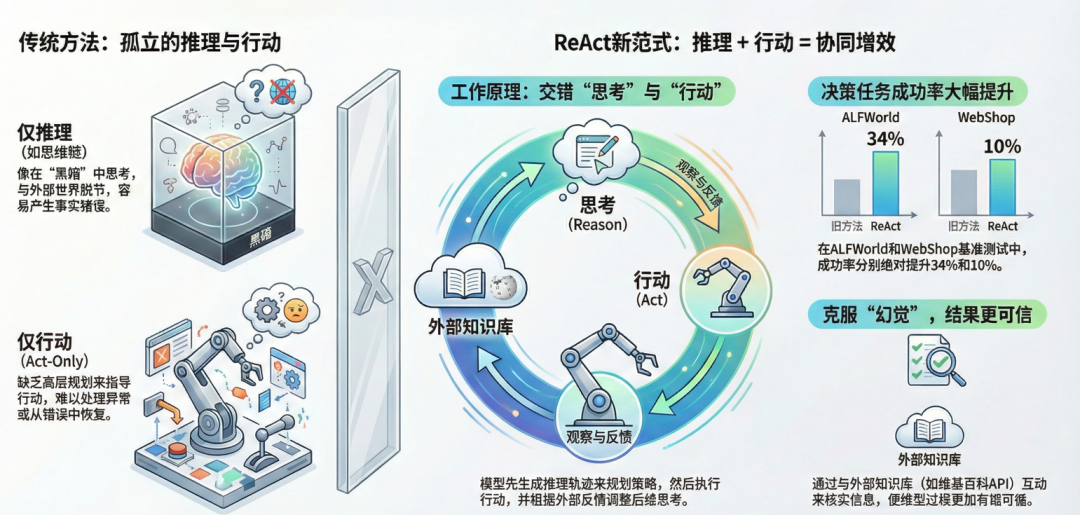 这些功能的作用体现在多个方面:首先,减少幻觉和错误传播,提高任务准确率;其次,提升模型的鲁棒性,能处理不确定性和异常;最后,促进可扩展性,支持多模态集成。 在实际作用上,ReAct将语言模型转化为智能代理,适用于需要环境交互的场景,如实时监测系统。该范式的作用还延伸到伦理层面,通过外显轨迹增强透明度,降低黑箱风险。