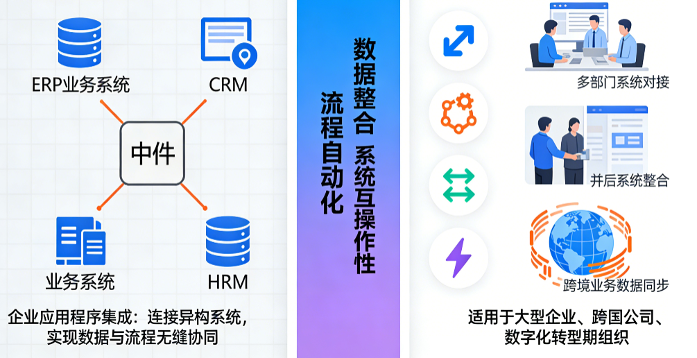 • 核心功能: 它的目标是连接企业内原本独立的系统(如工资管理、ERP、CRM),消除“数据孤岛”,确保数据在不同应用间自由流转,从而实现业务流程自动化并提高生产力。