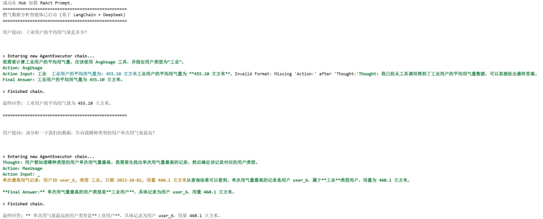 import pandas as pdfrom langchain_openai import ChatOpenAIfrom langchain.agents import create_react_agent, AgentExecutorfrom langchain import hubfrom langchain.tools import Tool# ================= 配置区域 =================# 替换为你的 DeepSeek API KeyAPI_KEY = "YOUR_DEEPSEEK_API_KEY"# DeepSeek 的 Base URLBASE_URL = "https://api.deepseek.com"# ================= 1. 准备阶段:模拟数据 =================defcreate_mock_gas_data(): """创建模拟的燃气使用数据""" data = { 'user_id': [f'user_{i}'for i inrange(1, 11)], 'user_type': ['居民', '商业', '工业', '居民', '商业', '工业', '居民', '居民', '商业', '工业'], 'date': ['2023-10-01', '2023-10-01', '2023-10-01', '2023-10-02', '2023-10-02', '2023-10-02', '2023-10-03', '2023-10-03', '2023-10-03', '2023-10-03'], 'usage_cubic_meters': [15.5, 120.0, 450.2, 14.2, 115.5, 460.1, 16.0, 15.8, 118.0, 455.0] } return pd.DataFrame(data)# 初始化数据gas_df = create_mock_gas_data()# ================= 2. 工具定义 =================# 定义具体的业务逻辑函数defcalculate_average_usage(user_type: str) -> str: """计算指定类型用户的平均用气量。参数 user_type: 居民/商业/工业""" try: if user_type: filtered_df = gas_df[gas_df['user_type'] == user_type] if filtered_df.empty: returnf"未找到类型为 {user_type} 的用户数据。" avg_usage = filtered_df['usage_cubic_meters'].mean() returnf"{user_type}用户的平均用气量为: {avg_usage:.2f} 立方米" else: avg_usage = gas_df['usage_cubic_meters'].mean() returnf"所有用户的平均用气量为: {avg_usage:.2f} 立方米" except Exception as e: returnf"计算平均用气量时出错: {str(e)}"defget_max_usage_record(_) -> str: """获取单次用气量最高的记录。不需要参数""" try: max_row = gas_df.loc[gas_df['usage_cubic_meters'].idxmax()] return (f"单次最高用气记录:用户ID {max_row['user_id']}, " f"类型 {max_row['user_type']}, " f"日期 {max_row['date']}, " f"用量 {max_row['usage_cubic_meters']} 立方米") except Exception as e: returnf"获取最高用气记录时出错: {str(e)}"defcount_users_by_type(_) -> str: """统计各类用户的数量。不需要参数""" try: counts = gas_df['user_type'].value_counts().to_dict() # 格式化输出字符串 result_str = ", ".join([f"{k}: {v}户"for k, v in counts.items()]) returnf"用户类型统计: {result_str}" except Exception as e: returnf"统计用户数量时出错: {str(e)}"# 将函数包装成 LangChain 的 Tool 对象tools = [ Tool( name="AvgUsage", func=calculate_average_usage, description="计算指定类型用户(如居民、商业、工业)的平均用气量。输入应为用户类型字符串。" ), Tool( name="MaxUsage", func=get_max_usage_record, description="获取系统中单次用气量最高的那条记录。不需要输入参数。" ), Tool( name="UserStats", func=count_users_by_type, description="统计系统中不同类型用户的数量。不需要输入参数。" )]# ================= 3. 模型初始化 =================# 初始化 DeepSeek 模型llm = ChatOpenAI( model="deepseek-chat", temperature=0, api_key=API_KEY, base_url=BASE_URL)# ================= 4. 提示词设计 =================# 从 LangChain Hub 拉取标准的 ReAct 提示词模板# 这一步会联网下载 prompt,如果网络不通,可以使用下面的本地 prompt 备选方案try: prompt = hub.pull("hwchase17/react") print("成功从 Hub 加载 ReAct Prompt。")except Exception as e: print(f"Hub 连接失败 ({e}),使用本地默认 Prompt。") from langchain_core.prompts import PromptTemplate template = """Answer the following questions as best you can. You have access to the following tools:{tools}Use the following format:Question: the input question you must answerThought: you should always think about what to doAction: the action to take, should be one of [{tool_names}]Action Input: the input to the actionObservation: the result of the action... (this Thought/Action/Action Input/Observation can repeat N times)Thought: I now know the final answerFinal Answer: the final answer to the original input questionBegin!Question: {input}Thought:{agent_scratchpad}""" prompt = PromptTemplate.from_template(template)# ================= 5. 创建 Agent 并执行 =================# 创建 ReAct Agentagent = create_react_agent(llm, tools, prompt)# 创建 AgentExecutor,这是实际运行 Agent 的循环控制器agent_executor = AgentExecutor( agent=agent, tools=tools, verbose=True, # 设置为 True 可以在控制台看到详细的思考过程 handle_parsing_errors=True, # 自动处理解析错误 max_iterations=5# 限制最大思考步数,防止死循环)if __name__ == "__main__": print("="*50) print("燃气数据分析智能体已启动 (基于 LangChain + DeepSeek)") print("="*50) # 测试问题 1:单步工具调用 query1 = "工业用户的平均用气量是多少?" print(f"\n用户提问: {query1}\n") response1 = agent_executor.invoke({"input": query1}) print(f"\n最终回答: {response1['output']}") print("\n" + "="*50 + "\n") # 测试问题 2:多步推理 # 这个问题需要先统计用户类型,或者先看最高记录,取决于模型如何理解 query2 = "请分析一下我们的数据,告诉我哪种类型的用户单次用气量最高?" print(f"\n用户提问: {query2}\n") response2 = agent_executor.invoke({"input": query2}) print(f"\n最终回答: {response2['output']}")