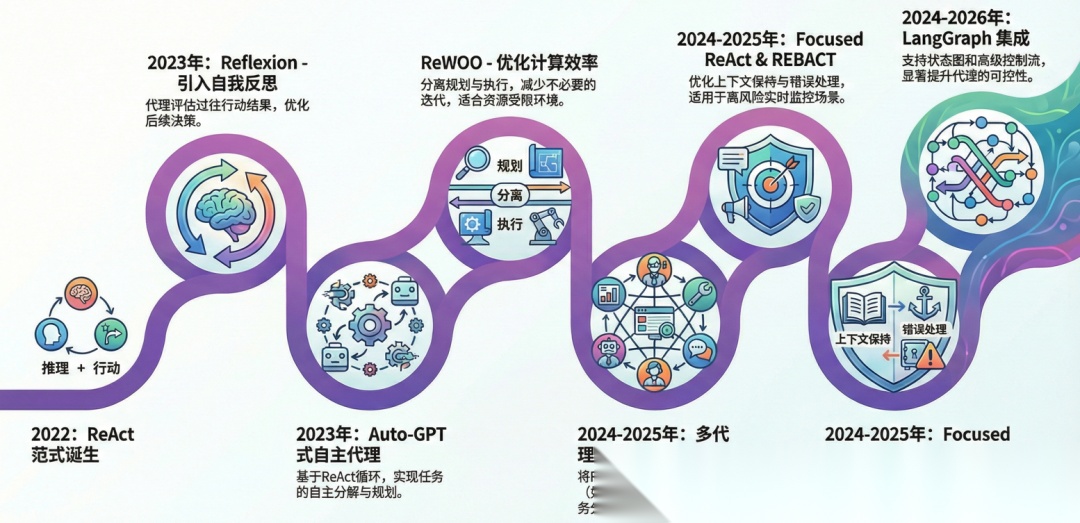 自2022年提出以来,ReAct范式已演变为多种变体,以适应多样化应用场景。这些发展主要聚焦于提升鲁棒性、效率和扩展性,特别是在2023-2026年间,受agentic AI趋势驱动。