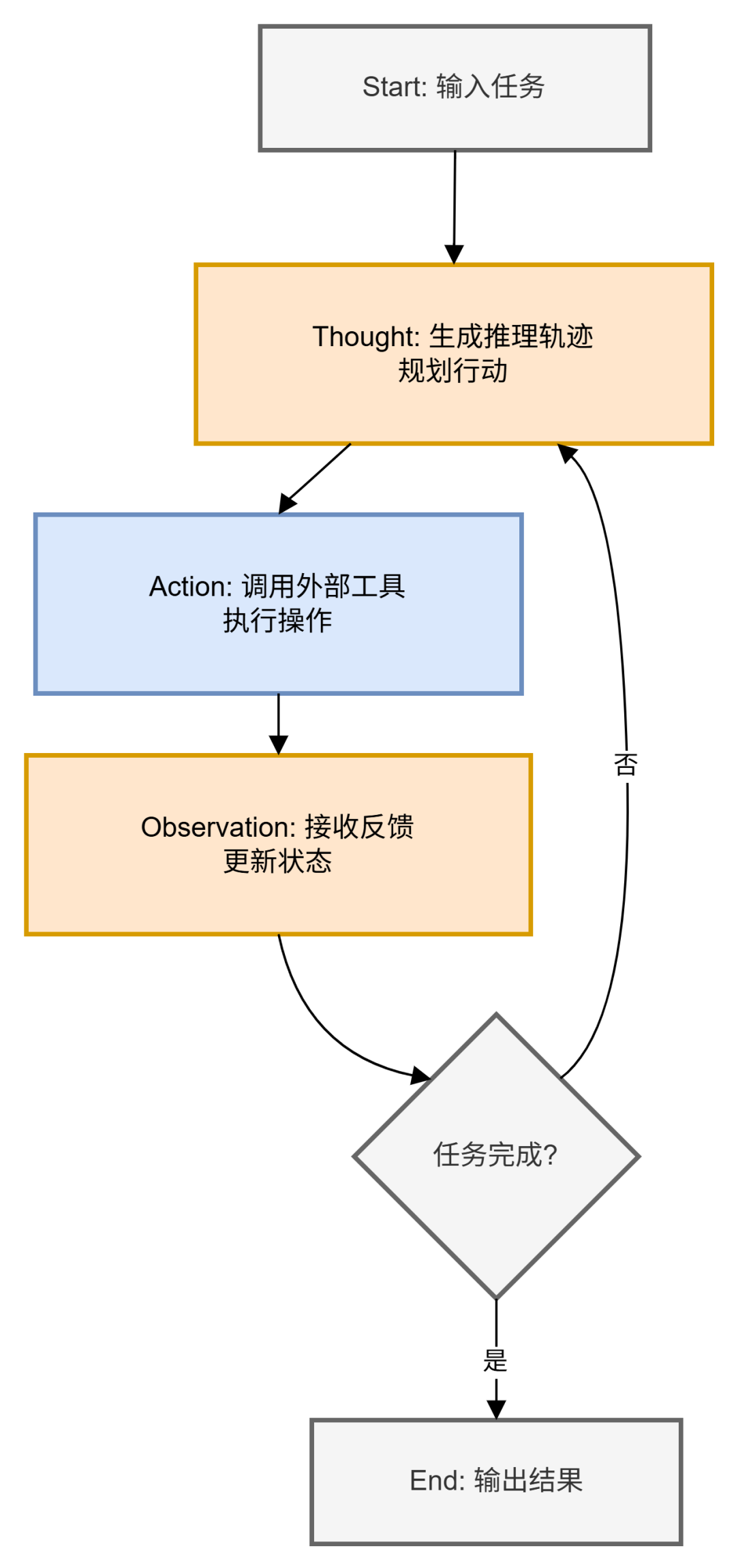 - • 循环执行:迭代生成Thought,执行Action,注入Observation,直至任务完成或达上限。