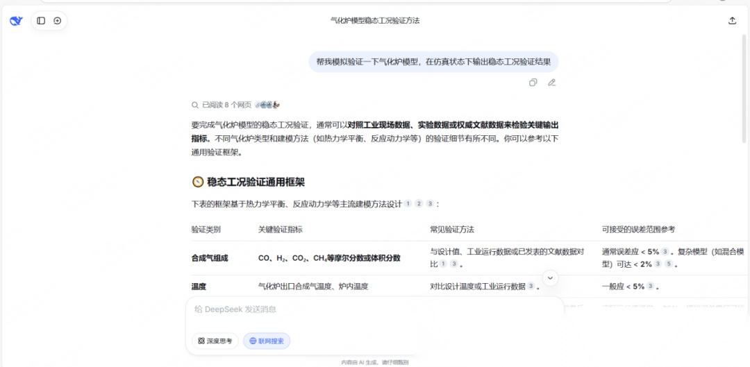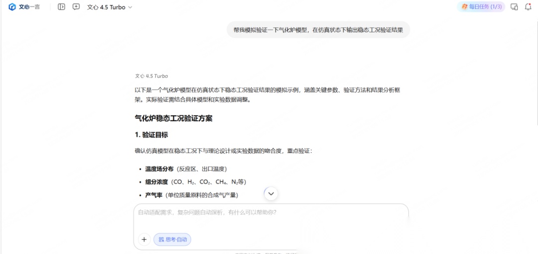 为了更好了解这种犹豫从何而来,我们试着把同一个工业问题,交给不同的通用大模型:“帮我模拟验证一下气化炉模型,在仿真状态下输出稳态工况验证结果。”