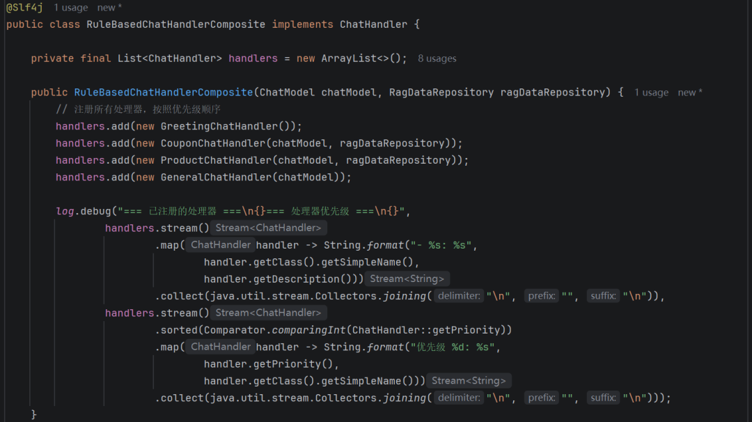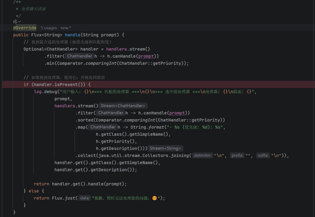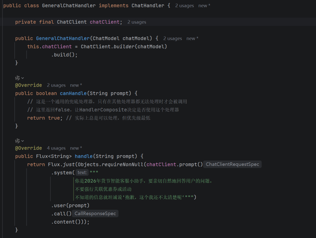 - GreetingChatHandler 就是单纯的返回问候信息的聊天处理器