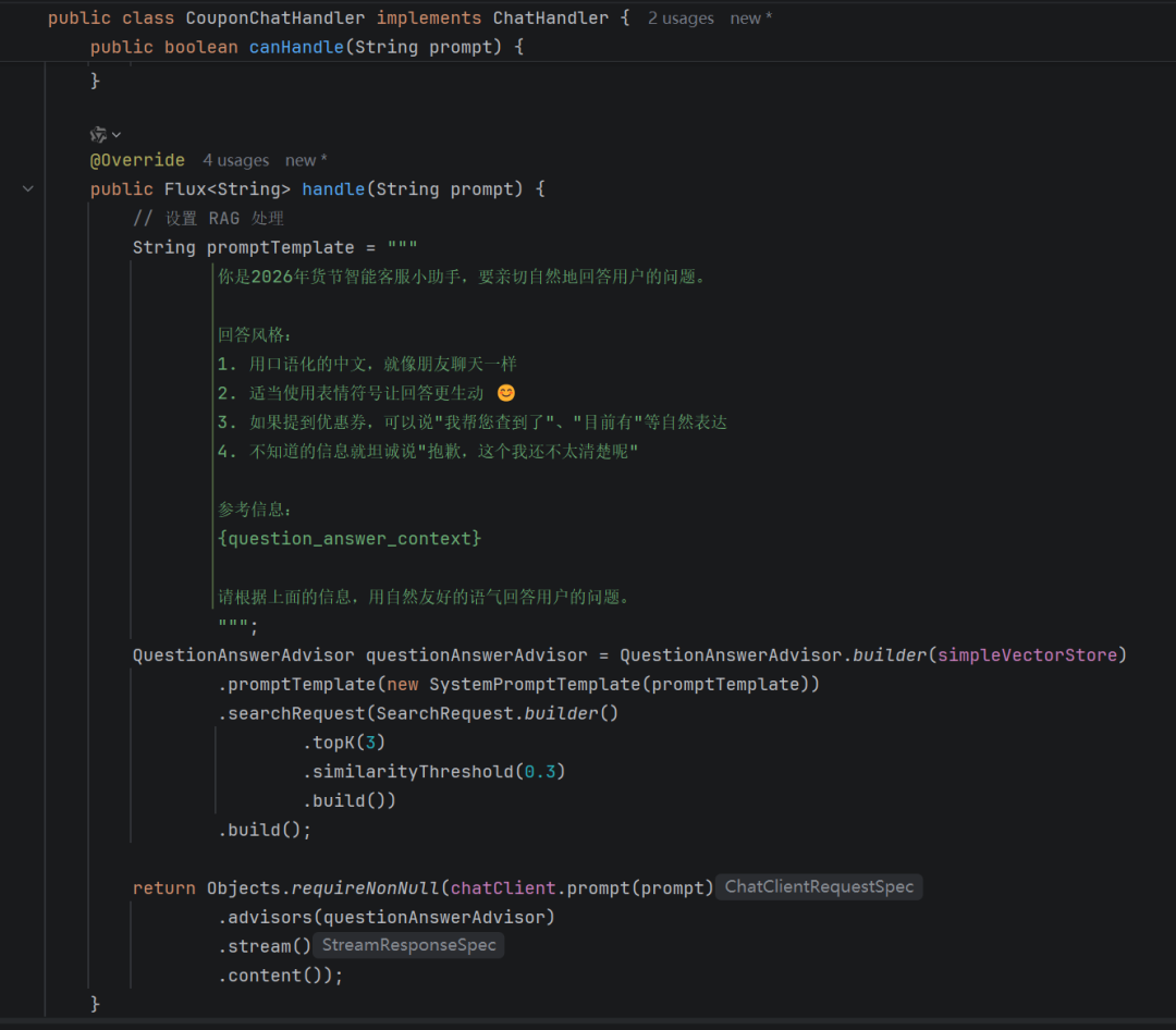 实现逻辑,即前面实现的 RAG ,只是将其封装到 CouponChatHandler 中。