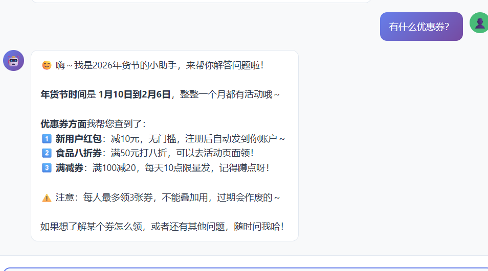 从我们案例的表现就是,大模型变成只会回答优惠券的问题了,任何无关紧要的也会扯到优惠券上面去,如下图: