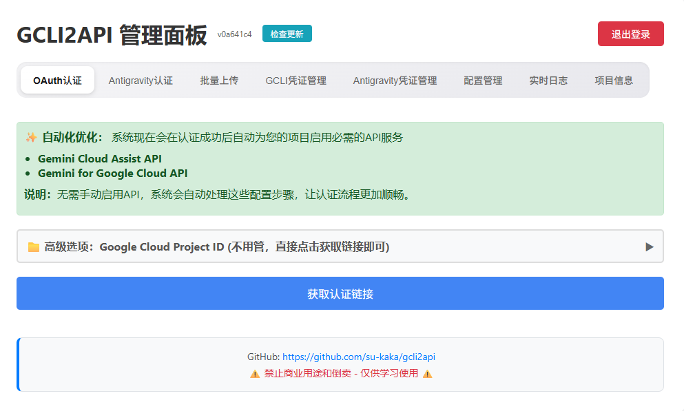 4、在浏览器里输入http://127.0.0.1:7861 打开控制面板,输入默认密码 pwd。出现类似这样的界面。点击“获取认证链接”,出现gemini登录的一长串链接,点击,登录账号授权。这时候下面会出现新的“获取认证文件”。之后文件会默认出现在“GCLI凭证管理”里面。