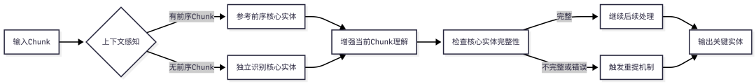 采用跨 chunk 上下文感知机制:当前 chunk 的核心实体提取会参考前一个 chunk 的结果(previous_key_entity),确保实体链的一致性;