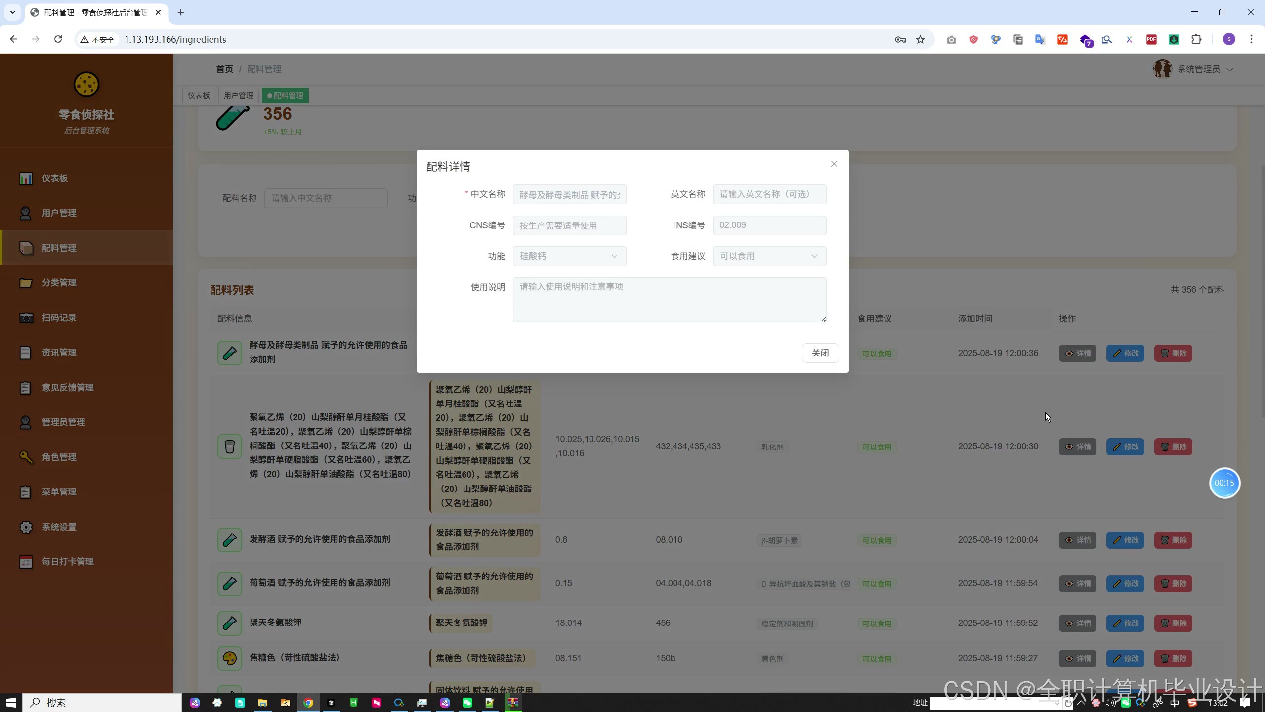配料管理:配料与添加剂的百科维护,包括中英文名、CNS/INS、功能、安全等级、摄入量、过敏原、食用建议等。