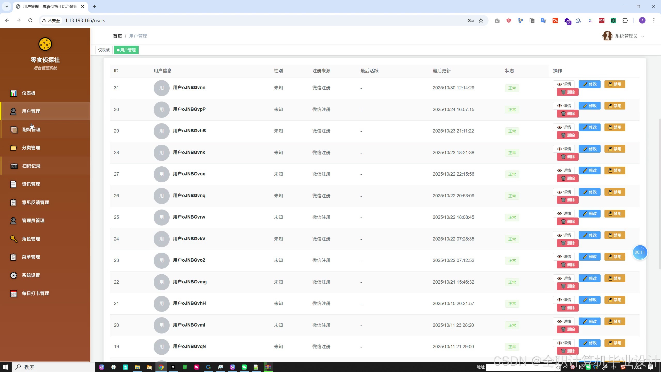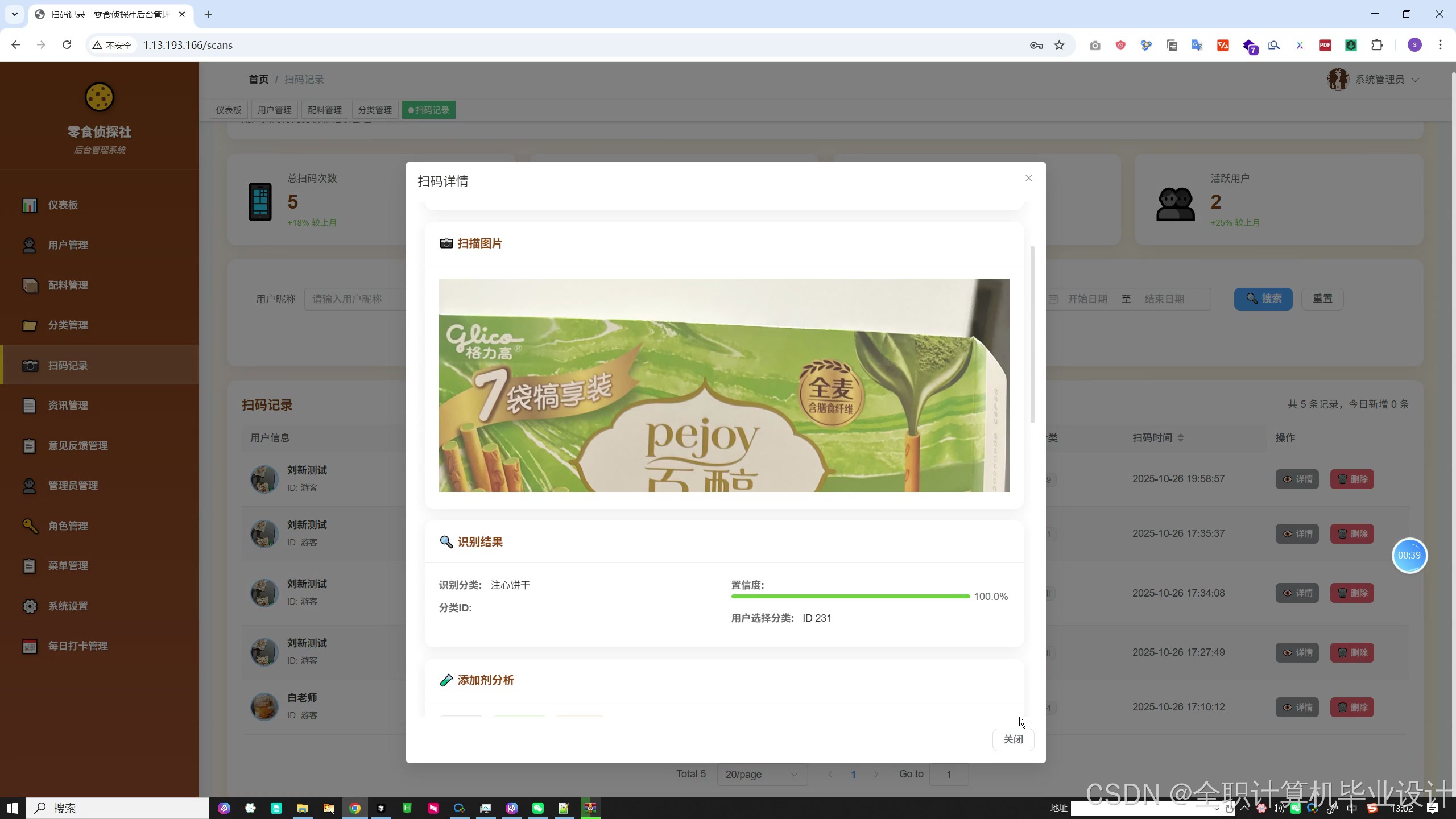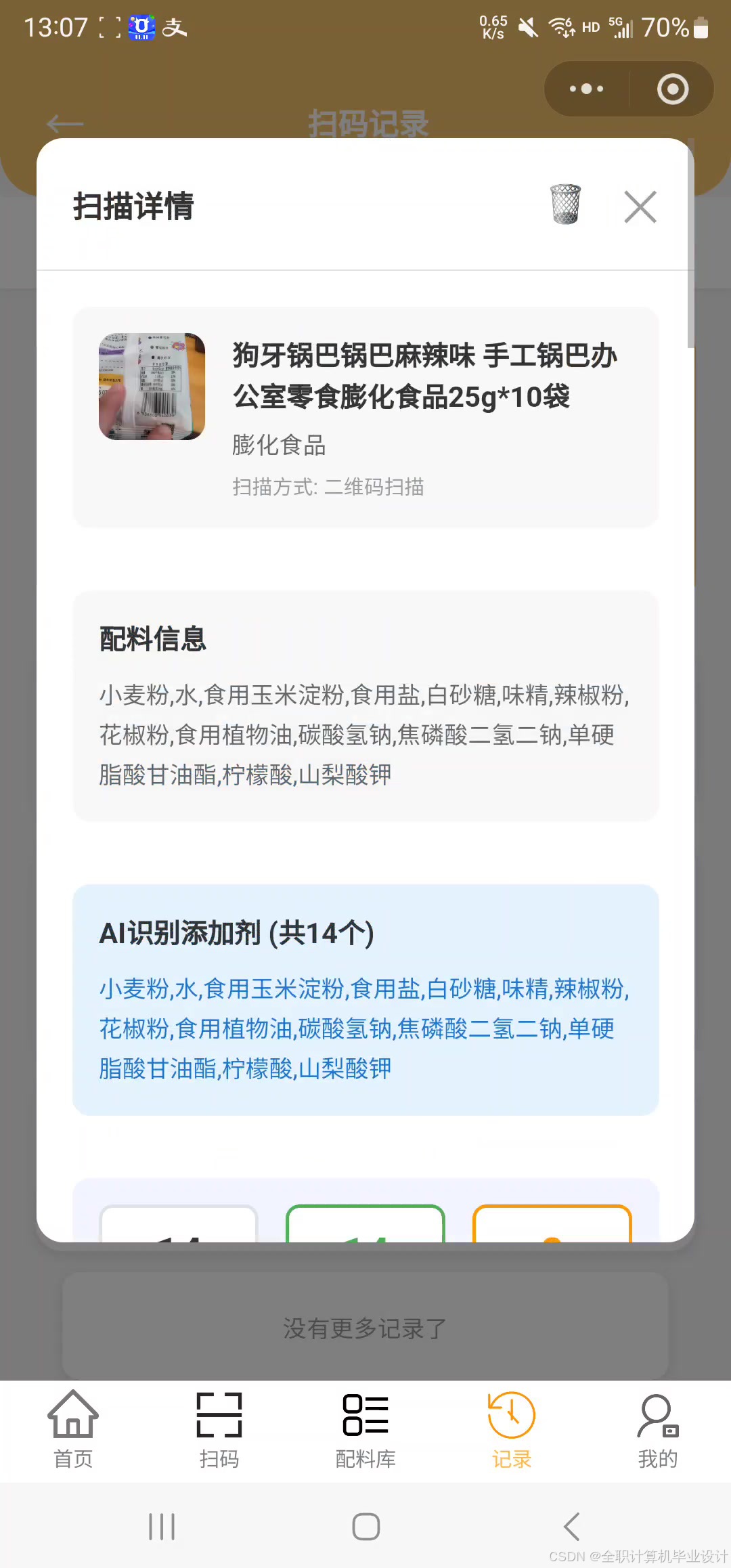 零食识别系统 以「扫码 → 识别 → 配料解析 → 添加剂匹配 → 安全建议」为主线,整合条形码、OCR 与 AI 多模态能力,并配套配料库、成就系统、打卡、资讯与完整管理后台。若你正在做零食/食品成分识别、添加剂合规或健康科普类产品,可参考本系统的功能划分与技术组合;上述长标题与功能介绍可直接用于博客、项目说明或答辩文档,按需删减或补充即可。