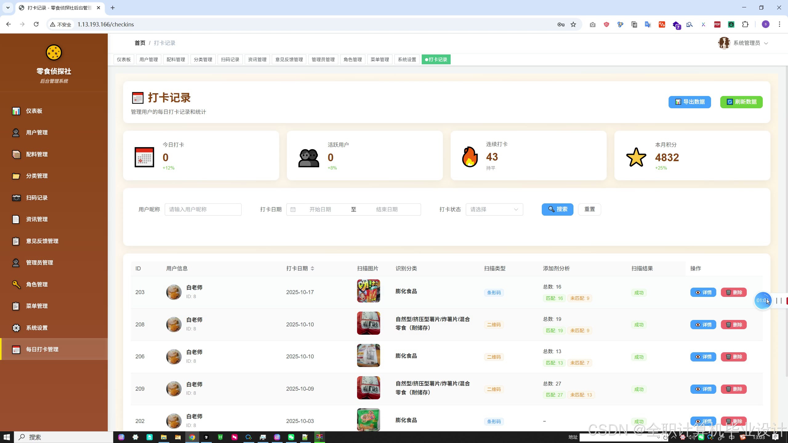 打卡记录:全部用户的打卡流水,支持按用户、日期、条码等筛选;可查看 OCR 结果、添加剂分析、备注等。