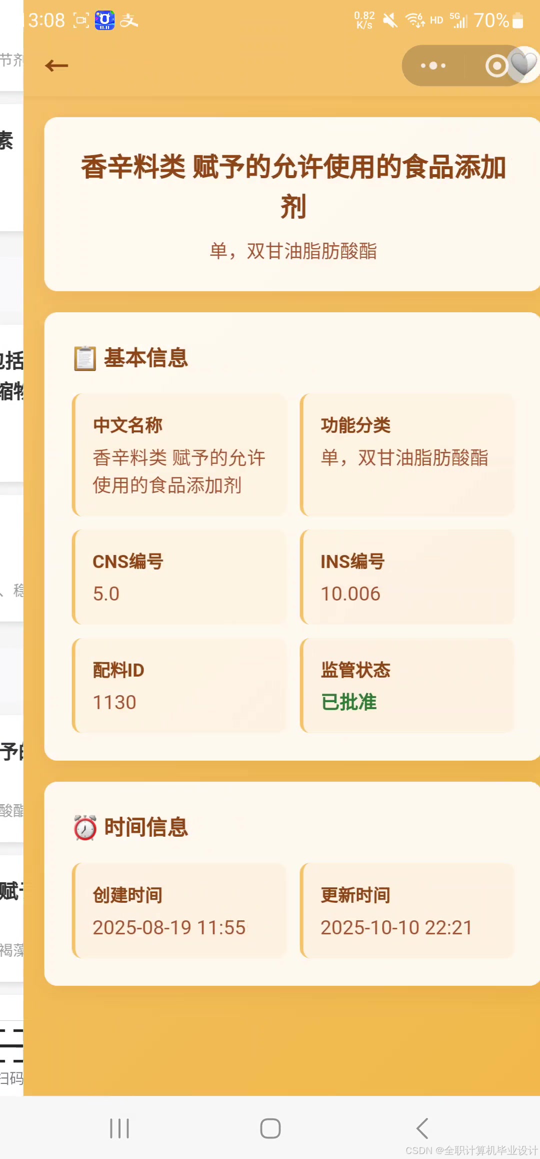 展示食品名称、分类、配料/添加剂列表。