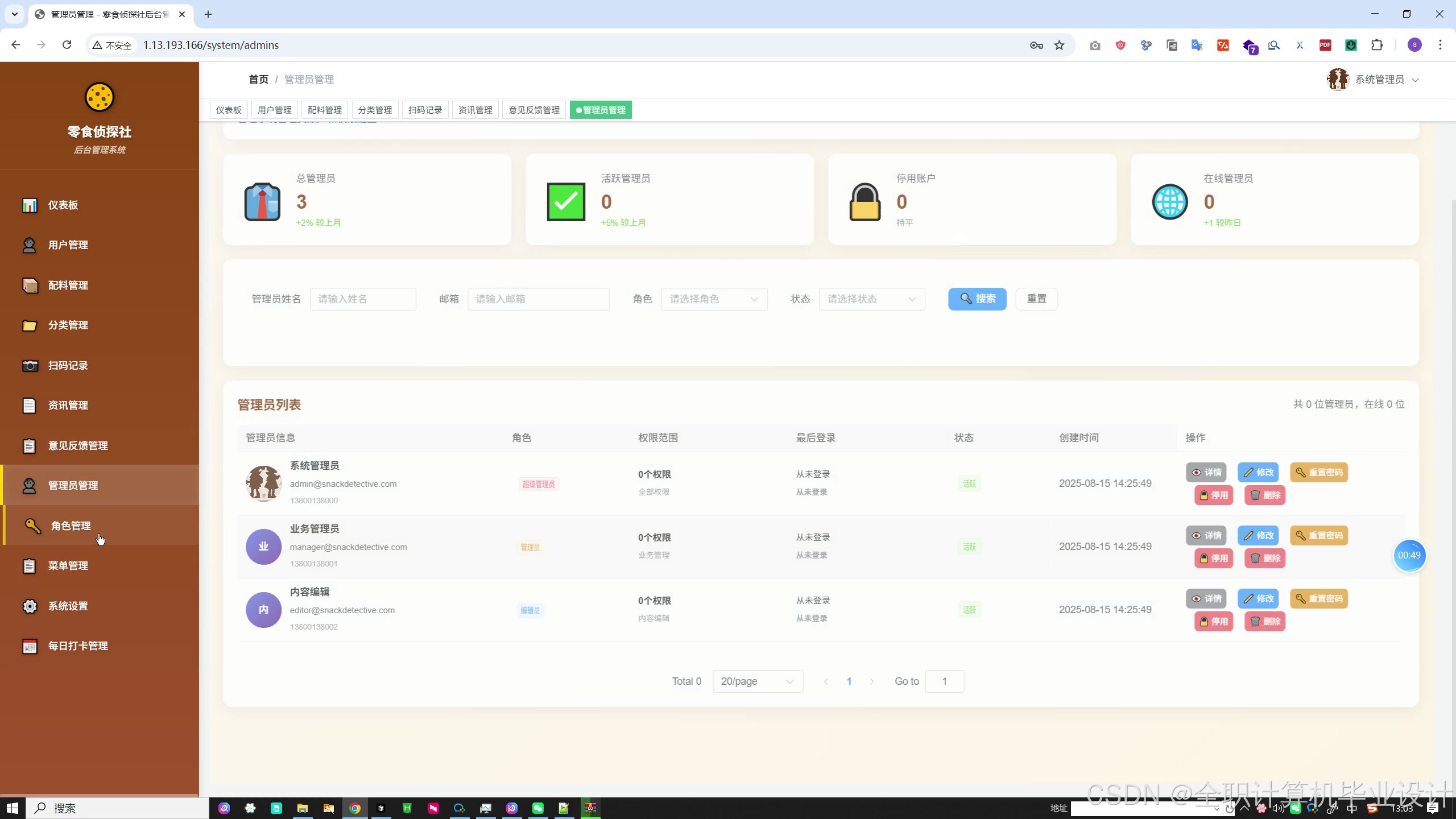 管理员管理:管理员账号的增删改、状态、密码重置等。