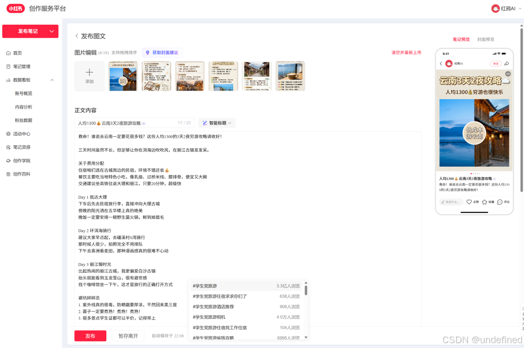•第一步:输入主题。 你只需要输入一个核心词,比如“秋冬显白美甲”或者“云南大理攻略”,系统甚至支持你上传参考图,让AI学习你想要的视觉风格。