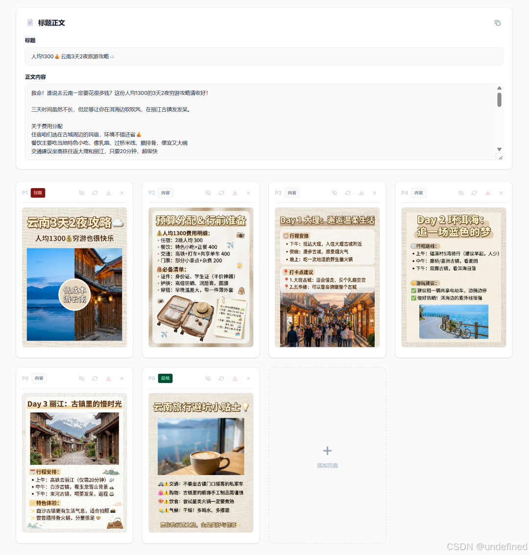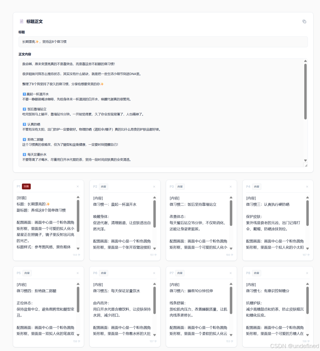 •第二步:生成文案与每张图的图片内容大纲。 这一步会直接给出爆款潜力的标题、正文,以及每一张配图的具体描述,包括图上的文字排版。