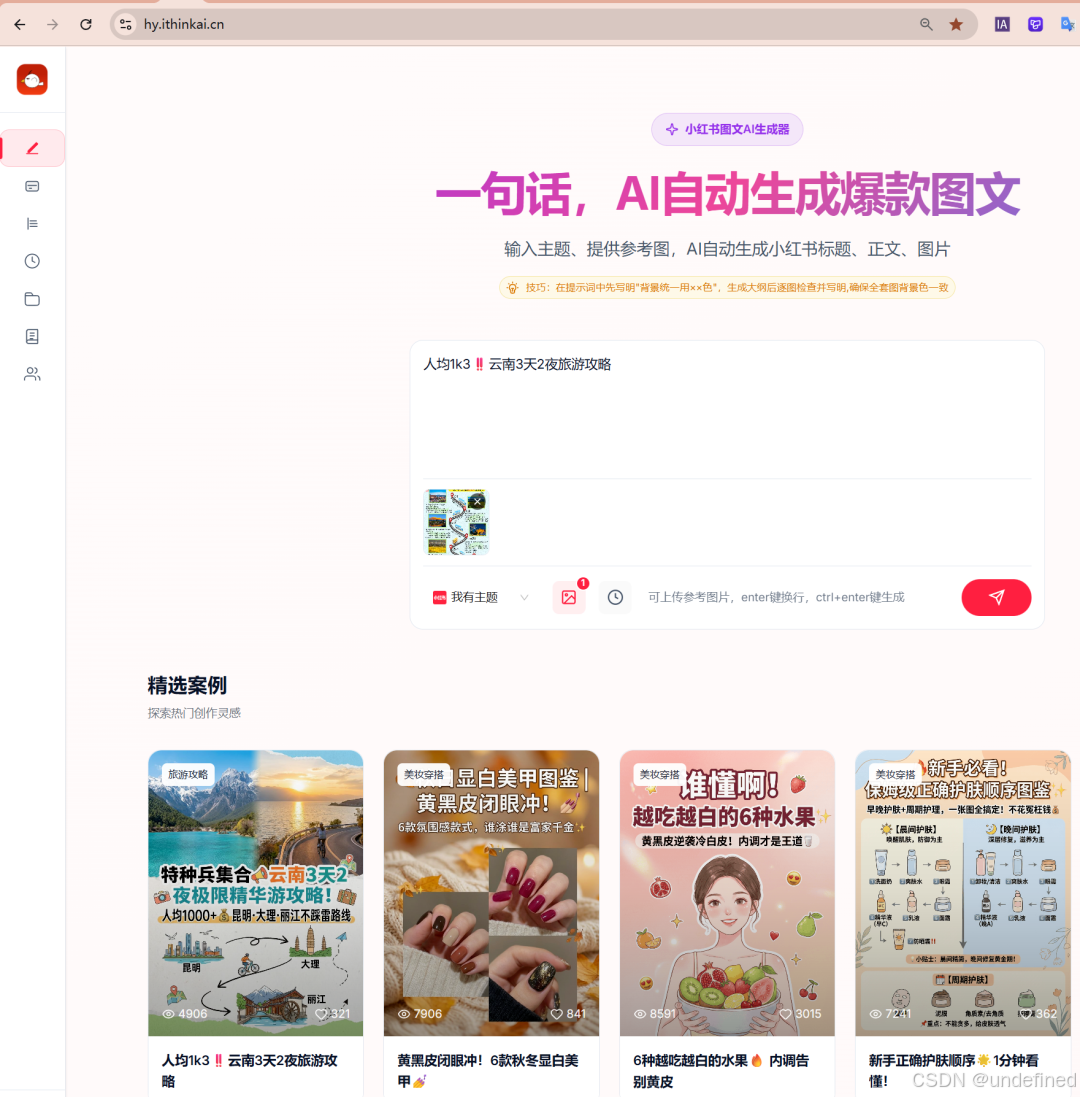 •第一步:输入主题,也可以根据需要上传参考图。 你可以直接丢一个关键词,比如“云南旅游攻略”,AI会自动抓取当下的流行风格。
