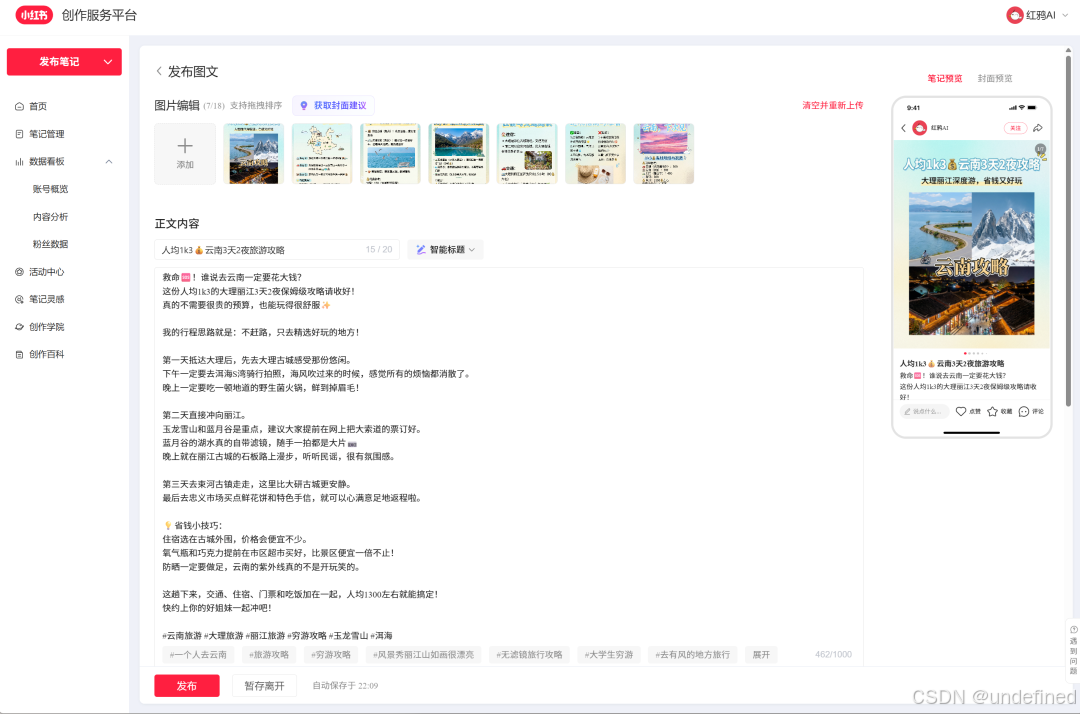 以前一个旅行社获客笔记,从写脚本到配图,可能需要半天;现在利用【红鸦 AI】配合几个文本模型,整个过程也就几分钟。