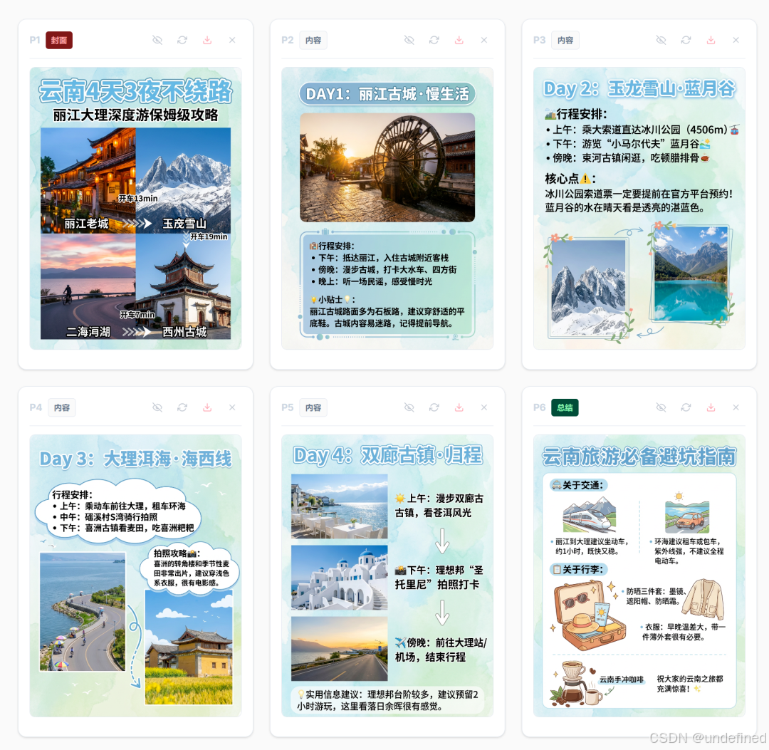 案例 A:昆明+大理旅游攻略 对于旅行社获客来说,这种高颜值的景点攻略一键生成简直是引流杀手锏。