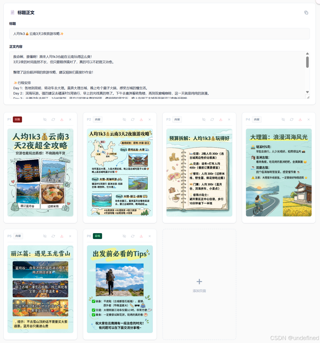 它最核心的能力就是:【一句话生成小红书/小绿书图文】。而且它解决了之前 AI 生成图片风格不统一的顽疾,背景色、字体排版能做到高度一致,非常适合【旅游私域引流】或【产品种草图文】。