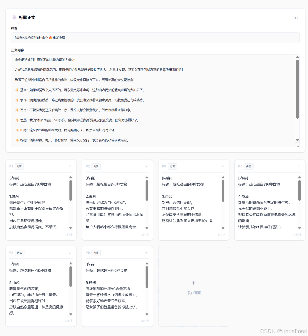 •第二步:生成文案、图片大纲。 它会自动吐出【爆款标题】、【人感正文】以及每张图的【文案+配图描述】。最老道的地方在于,这些内容你都能微调,想加减页面也只是点一下的事儿。