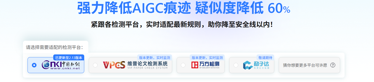 我之所以选它,是因为它主打结构级优化,它不是简单的换词,而是会重构语序、句型和逻辑节奏,把机器语言那种完美逻辑打散,变成真正的人类书面语。而且它支持知网、维普、万方三大平台的算法更新。