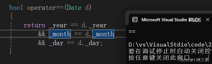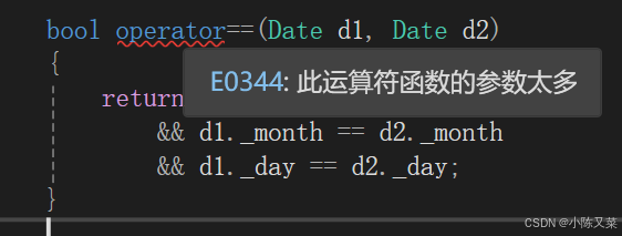 这里C++给出了一个关键字operator,后面加上运算符,称作函数运算符重载。然后我们还是通过上面Date d1、d2比较的例子来对此进行说明,例如我们这里将==运算符重载:代码语言:javascriptAI代码解释。