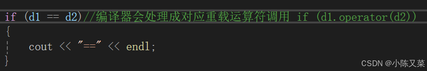 if (d1 == d2)//编译器会处理成对应重载运算符调用 if (d1.operator(d2))