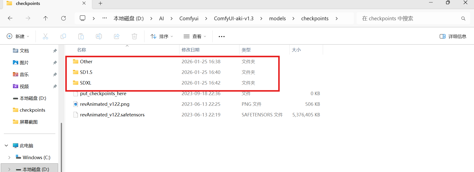 checkpoints里建二级文件夹分类存放,也可以直接放进去,ComfyUI 都能识别。