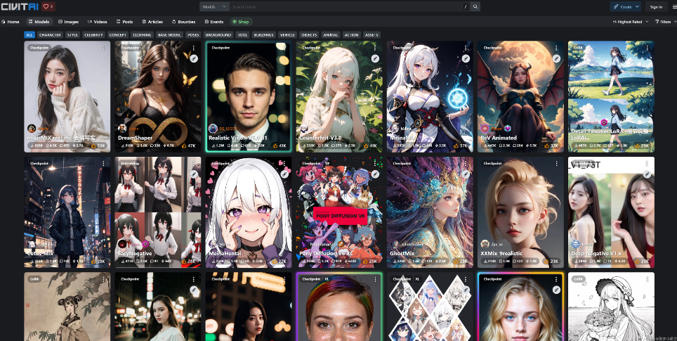 Civitai 是业内老牌的模型网站,也被称作 C 站。