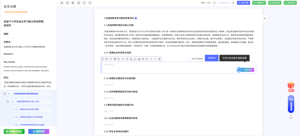 2.内容创作:规避“代写式生成”,聚焦灵感激发与逻辑梳理——输入关键词可生成思维导图、研究框架,推荐前沿选题与案例参考;可修正口语化表述、规范专业术语,提取文章结构并支持章节拖拽调整,确保全文逻辑连贯。