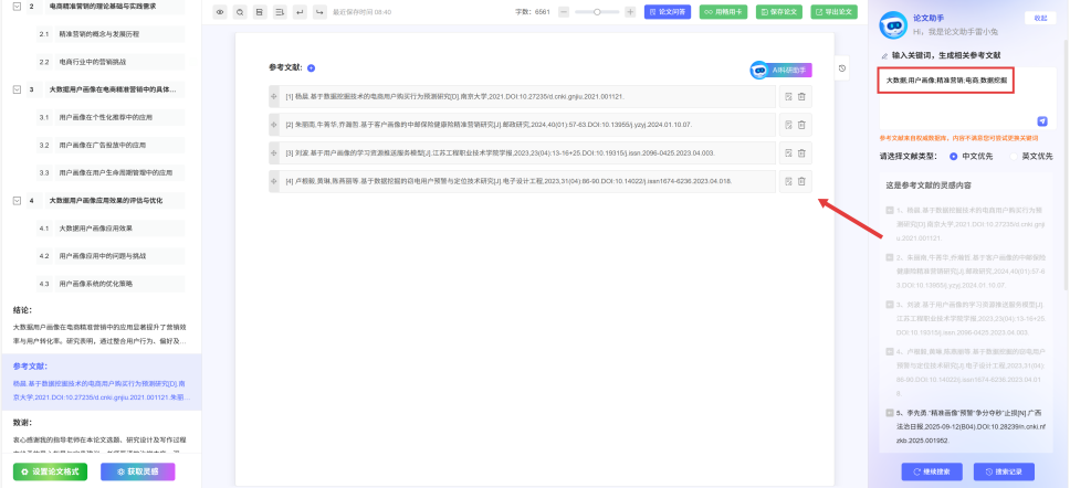 1.文献处理:内置知网、万方等国内数据库接口,推荐文献真实可查,作者、年份、期刊信息完整,支持一键检索验证;可自动生成符合本科规范的参考文献列表,适配APA、MLA及各高校自定义引用格式,无需手动整理。
