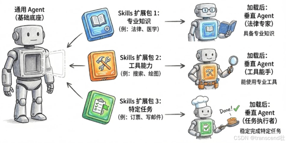 - 本质是其实就是相当于给 AI 代理发放一本专业手册,AI 不会每次都从零学习,而是根据任务自动调用手册中的知识。