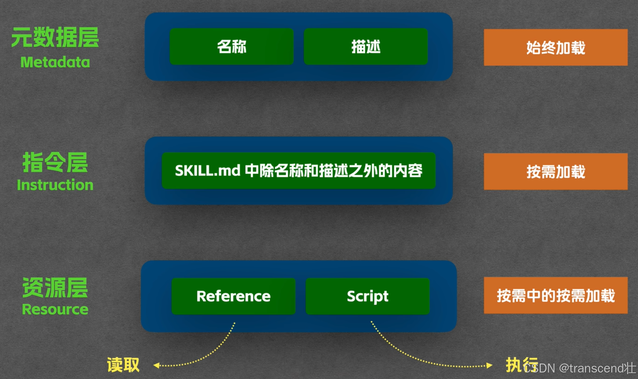 渐进式披露:体现了现代软件工程的模块化思维。将复杂度藏在幕后,仅在关键时刻呈现,让模型注意力始终保持高效聚焦。加载方式:加载"名字+描述",真正用到时才加载执行细节。节省上下文空间,降低Token成本。