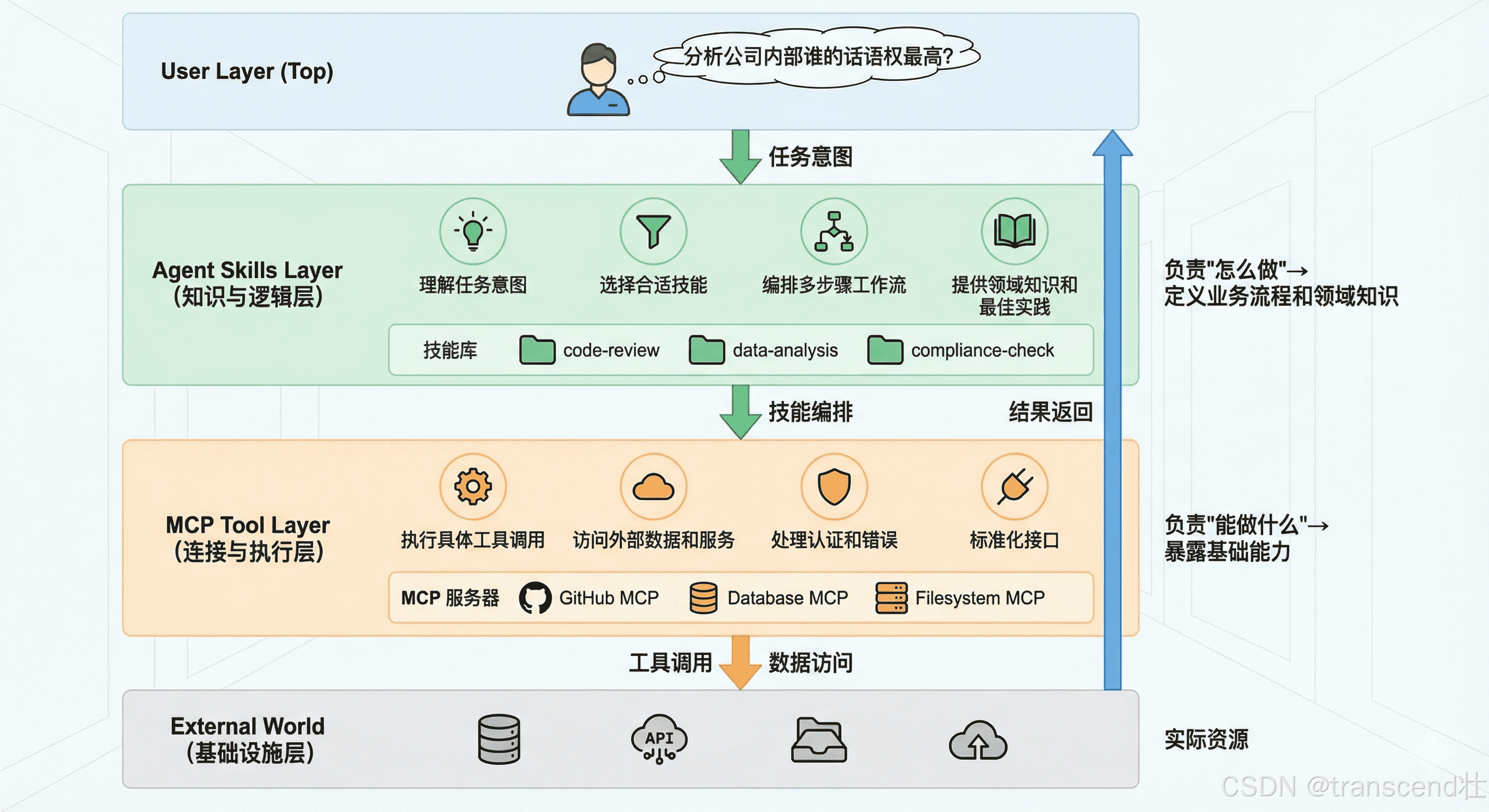 理解了两者的差异后,我们会发现:Skills 和 MCP 不是竞争关系,而是互补关系。最佳实践是将两者结合,形成分层架构: