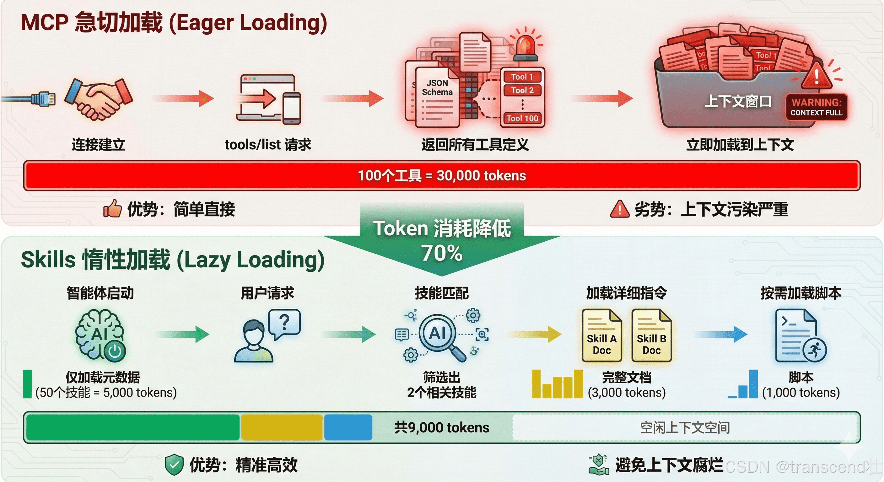 - MCP模式:每次做事前,先把所有说明书通通摊在桌子上。采用全量暴露策略,依赖模型自身的注意力机制去处理海量规则。