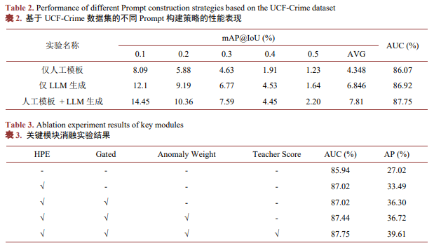 从表2中可以看到,仅使用人工模板时,模型在AUC上能够取得86.07%,但在mAP@IoU指标上整体表现较弱,平均值仅为4.38%。这表明人工模板虽然能够提供稳定、结构化的类别语义,但是特征表达方式比较单一,难以覆盖异常行为在时序演化和细粒度表现上的多样性,因而对异常片段的精确定位能力有限。