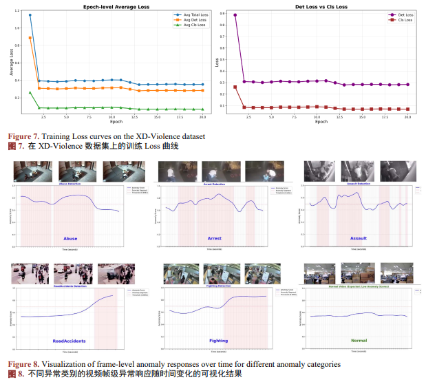 表1展示了SAGE-VAD与现有代表性方法在UCF-Crime和XD-Violence数据集上的性能对比,图7,图8分别是模型在训练以及测试过程中的可视化结果。通过表1可以发现传统的半监督方法(如GODS、GCL)由于依赖额外标注或特征,其整体性能明显受限。零样本方法在一定程度上受益于视觉语言模型的语义泛化能力,但在复杂场景下仍存在性能瓶颈。在弱监督的设置下,基于CLIP的方法整体优于传统3D CNN特征方法,验证了跨模态语义建模在视频异常检测中的有效性。在此基础上,SAGE-VAD在UCF-Crime上取得了87.75% ± 0.04%的AUC,在XD-Violence上达到了85.08% ± 0.11%的AP,相比于大多数弱监督方法有较为客观的增益,展示出语义增强与规则引导的优势。