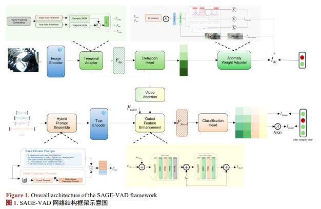 视频异常检测(Video Anomaly Detection, VAD)旨在从长时间监控视频中自动识别异常事件,是智能安防与智能交通等场景中的关键技术。受限于异常事件的稀有性与标注成本,现有方法多采用弱监督学习范式,但仍普遍面临异常语义表达不足、跨模态对齐失效以及标签噪声导致训练不稳定等问题。针对上述挑战,本文提出基于语义增强与规则引导的SAGE-VAD (Semantic-Augmented & Guided Enhancement for VAD)框架。设计混合提示集成(Hybrid Prompt Ensemble, HPE)机制,融合人工模板与大模型描述,构建高覆盖度的类别原型。并引入帧级规则分数(Teacher Score)作为先验,通过一致性约束抑制噪声激活并优化关键帧筛选。实验结果表明,本文方法在UCF-Crime和XD-Violence数据集上均取得了显著性能提升。其中,在UCF-Crime数据集上,本文法的视频级AUC达到87.47%,在XD-Violence数据集上,视频级AP提升至85.08%,验证了语义增强与规则引导机制在弱监督异常检测任务中的有效性。