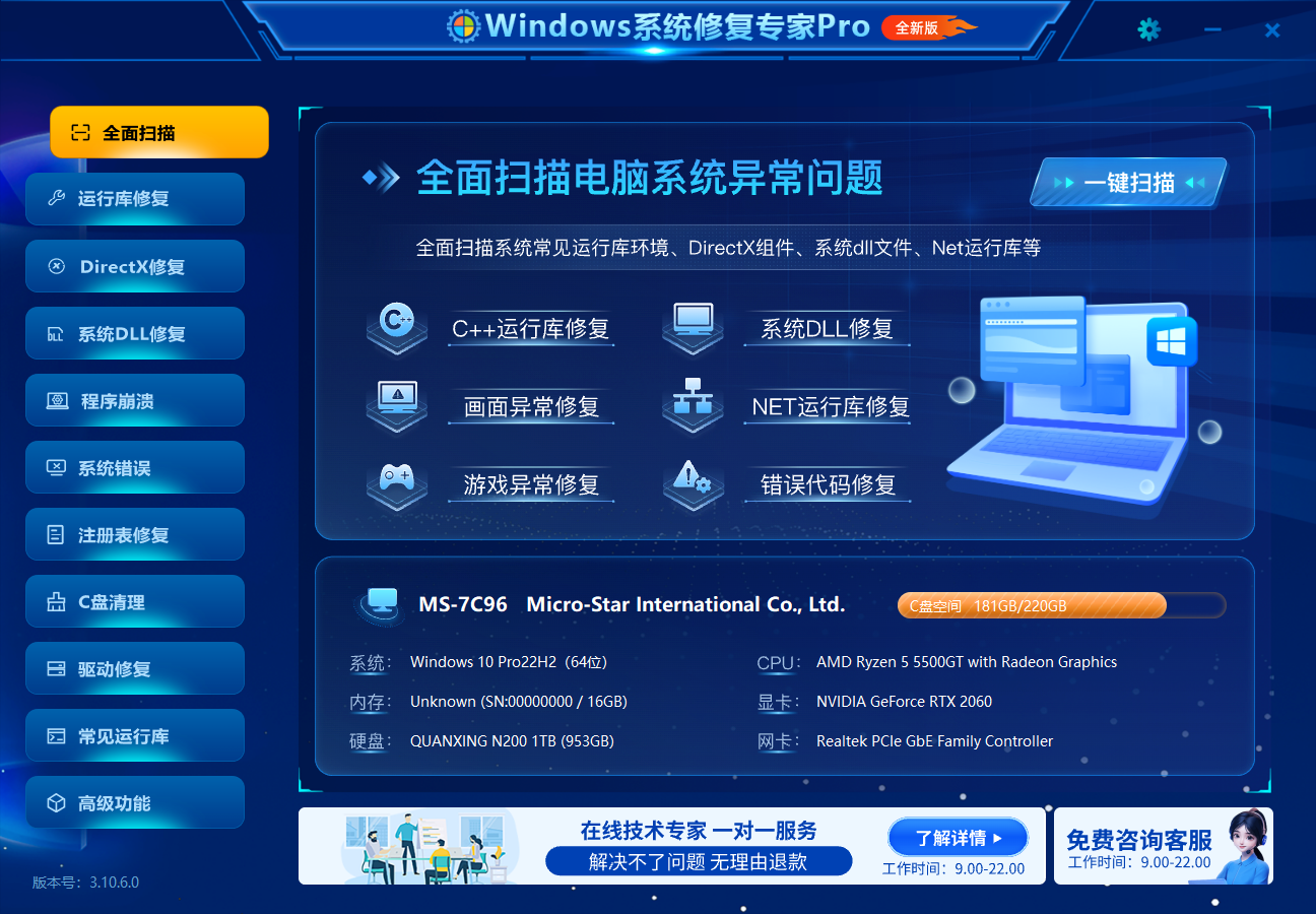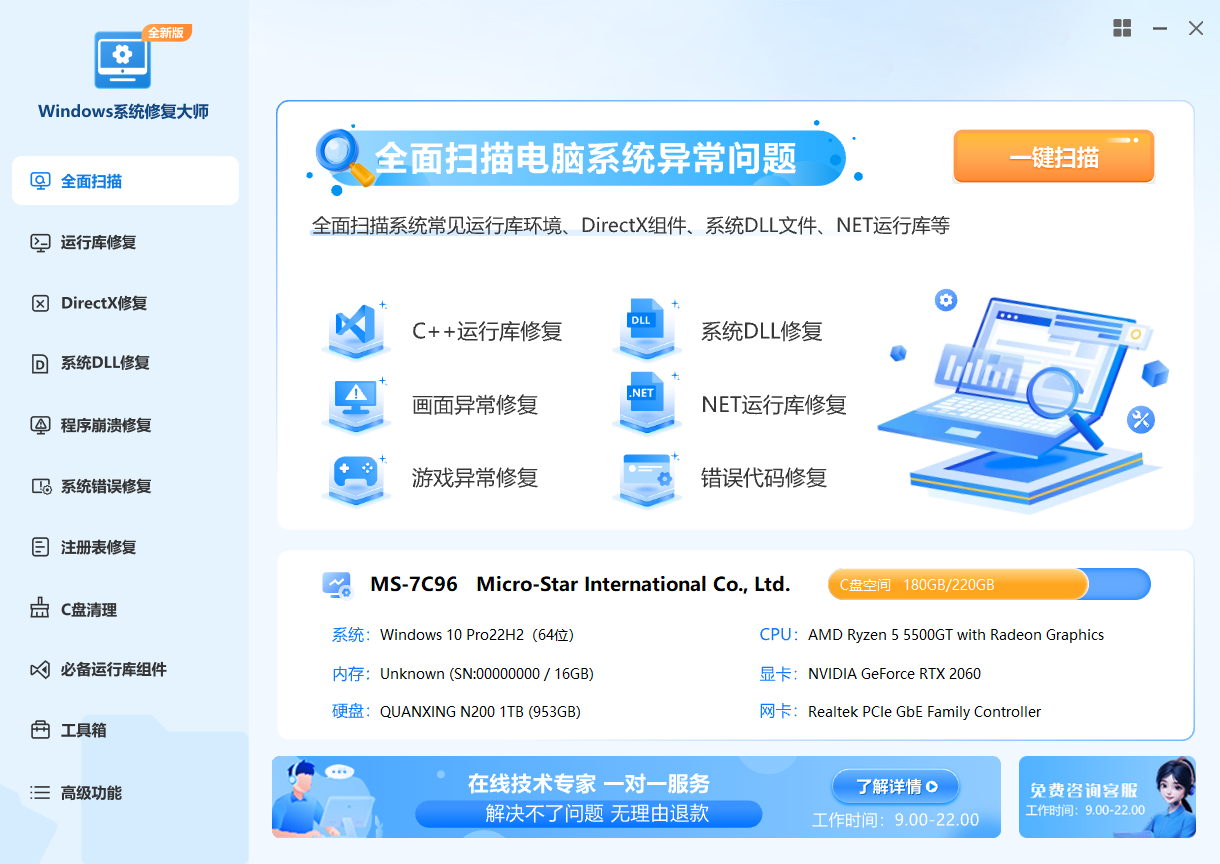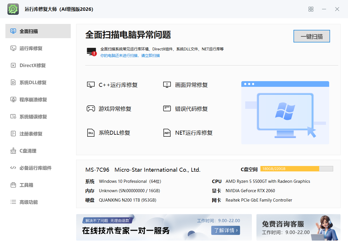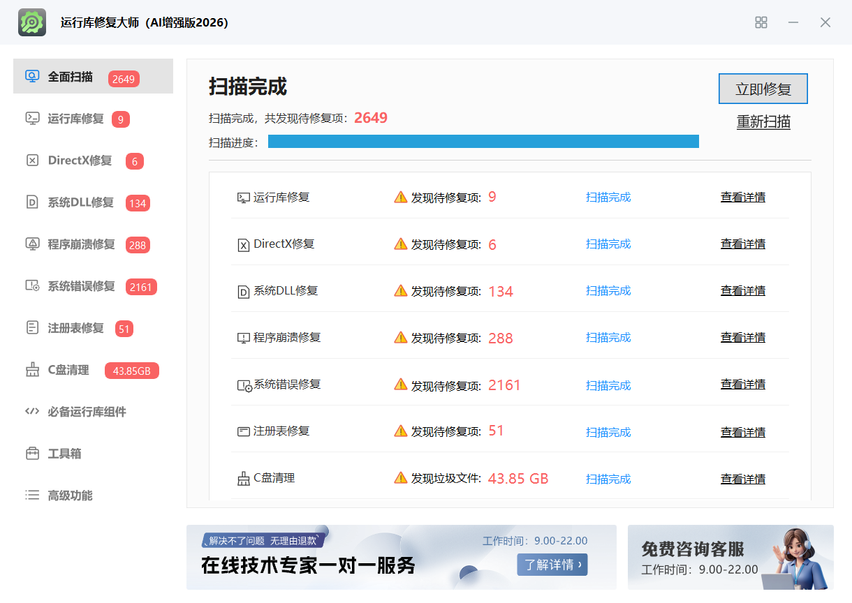 (1)AI 智能全扫描:一键检测电脑系统 DLL 缺失、C++ 运行库异常、DirectX 组件损坏等问题,精准定位不遗漏。