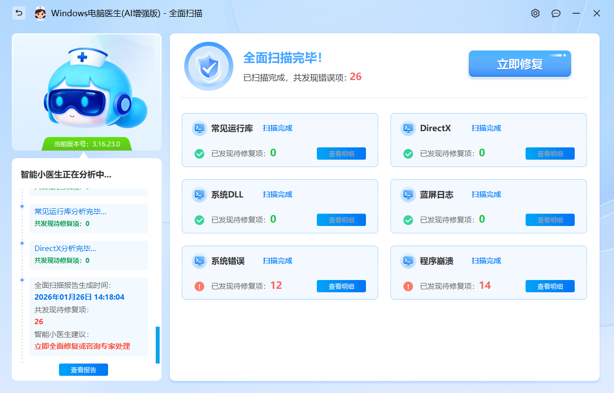 (1)深度故障诊断:它拥有“智能小医生”功能,能分析电脑的崩溃日志、温度监控(CPU/显卡温度)以及内存占用。全面扫描系统 DLL、运行库、蓝屏日志、冗余注册表,生成详细修复报告,可查看每项问题明细。