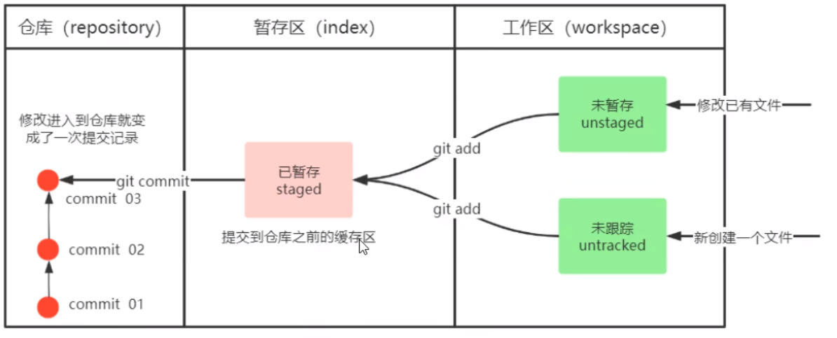 Git工作目录下对于文件的修改(增加、删除、更新)会存在几个状态,这些修改的状态会随着我们执行Git的命令而发生变化。